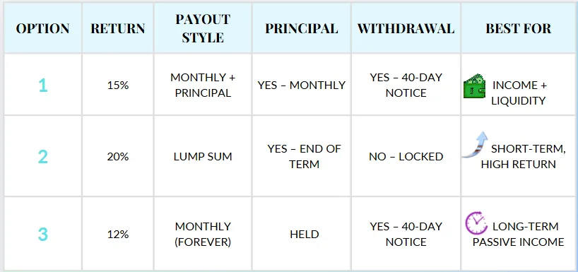 Earn passive income with monthly payouts. Your investment grows while you receive steady cash flow.